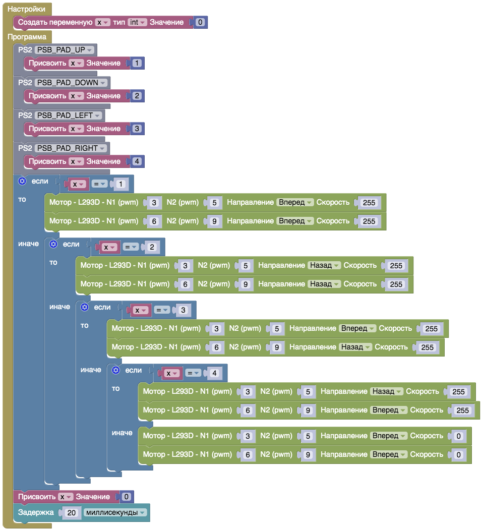 Получаем данные с PS2 и включаем пары моторов на робо платформе.