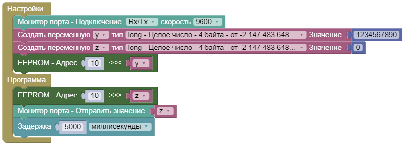 Запишем c 10 ячейки памяти число 1234567890 и прочитаем c 10 ячейки памяти число отправив в монитор порта.