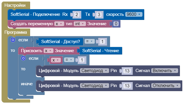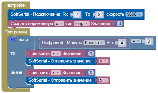 При нажатии на кнопку, отправим число 2 по SoftSerial.